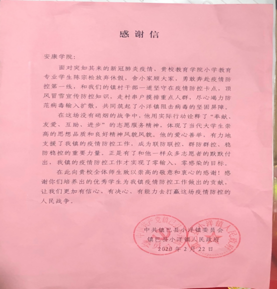 “在此向贵校全体师生致以崇高的敬意和衷心的感谢!感谢你们培养出的优秀员工为我镇疫情防控工作做出的贡献,让我们更加有信心、有决心、有能力去打赢这场疫情防控的人民战争。” 2月23日,太阳成集团tyc122ccvip收到来自汉中镇巴县人民政府的感谢信,对公司学子陈宗松积极参与当地防疫志愿服务工作进行表扬,尤其对其在抗击疫情的紧要关头,主动投身疫情防疫一线,充分发扬志愿服务精神及认真负责的工作态度给予肯定,同时对太阳成集团tyc122ccvip的人才培养工作表示感谢。
