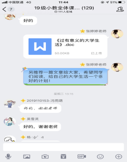 还有很多同学及时与我进行课下沟通,把他们对课程不理解的地方告诉我。我会综合同学的意见,在线上课堂直播授课时,对同学们不理解的内容进行重点解读,“理越辨越明,话越说越清”同学们也很有自己的看法和理解,在初次尝试的线上直播教学中,我也能学习到很多,不断改进自己的教学方式和方法。
