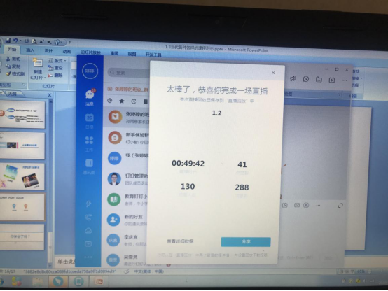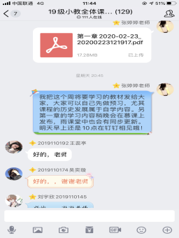 2月17日,正式开始线上教学。我主要讲授《课程与教学论》课程,共128名员工参与学习,但是由于第一天网络教学直播的冲击压力,慕课和雨课堂平台出现卡顿、延迟等现象。于是我及时改变授课工具,采用了钉钉直播。钉钉直播具有强大的屏幕分享+语音直播功能。该功能一方面确保了课程内容信息有效被传递,另一方面也为师生之间能够产生有效的互动提供了机会。除此之外,钉钉能够自动产生员工的打卡记录和直播回放,从而确保了员工能按时学习。