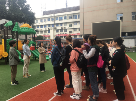 53名同学平均分配在幼儿园的16个班中,更近距离的观察和学习幼儿园一日常规和班级管理方法。短短五天的时间,同学们收获满满。照顾小朋友们盥洗,与孩子们一起游戏,教会孩子们制作手工等,真正体会到了幼儿教师的快乐、幸福,也有不易。