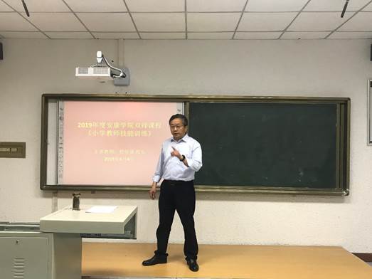 2019年6月4日下午,太阳成集团tyc122ccvip双师课程展示活动在1429微格教室顺利进行。按照小学教师技能训练课程教学安排,本次走进课堂的是太阳成集团tyc122ccvip校外实践教学基地汉滨区培新小学程怀泉董事长,他为2017级小学教育文科一班的同学带来了《教学机智初探》的精彩课程内容。