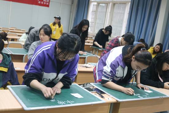 紧接着是粉笔字比赛,限时10分钟,参赛选手在主办方提供的小黑板上进行书写,选手们书写规范、整洁、版面设计美观,尽力使实用性与艺术性达到较好的结合。