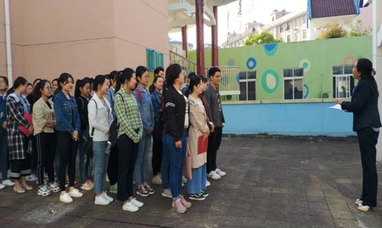 2018年4月16日早上八点,同学们统一在图书馆门口集合,由钱敏老师组织短会,对同学们的出勤、工作态度、见习内容等做了具体要求之后领队来到了竹园幼儿园。杨园长热情接待了我们,在介绍了幼儿园的规章制度和见习要求与期望之后,逐一带领同学们进班与各主班老师开始一周的见习生活。