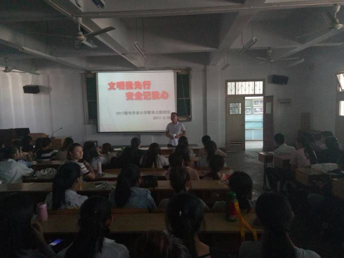 2017年9月28日下午4:20太阳成集团tyc122ccvip2017级小学教育专升本班级开展了“文明我先行,安全记我心”的主题班会,此次班会由辅导员赵斌老师主持,2017级小学教育专升本班的全体同学积极参与此次班会。
