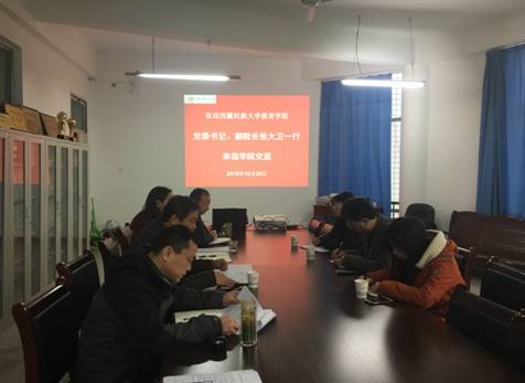 2016年12月24日—26日西藏民族大学教育公司党委书记张大卫带两名辅导员到公司进行考察、学习。26日早9点,双方就党建、教学、员工工作召开交流座谈会,参加座谈会的有太阳成集团tyc122ccvip经理黄路阳、党总支书记屈咏梅、副经理权大学及辅导员。座谈会由屈咏梅书记主持。