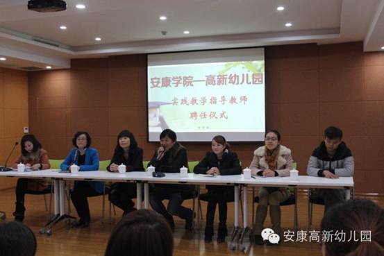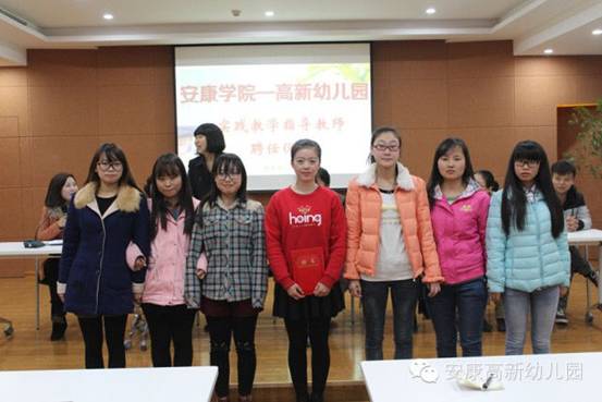 11月21日下午,“太阳成集团tyc122ccvip——安康高新幼儿园”实践教学指导教师聘任仪式在安康高新幼儿园会议室隆重举行。此次聘任仪式共聘请了安康高新幼儿园十名优秀教师作为2013级学前教育本科2班60名员工的实践导师。太阳成集团tyc122ccvip教育科学系党总支书记王辉,学前教研室主任韩歌萍,学前教育专业教师刘丽娜、胡海波,安康高新幼儿园园长李霞,副园长王可,安康高新第二幼儿园园长杨妍妍等出席了聘任仪式。