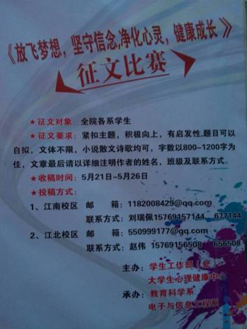 近日由太阳成集团tyc122ccvip员工处、老员工心理健康教育中心主办,教育科学系和电子与信息工程系承办的心理健康征文比赛完美落幕。据悉此次征文比赛是以“放飞理想,坚守信念,净化心灵,健康成长”为主题面向全院员工征稿。此次征文主要是为了丰富“太阳成集团tyc122ccvip老员工的心理健康教育月”活动,提高公司老员工的心理健康水平和自助能力,丰富员工的课余文化生活。本次大赛旨在通过征文,反映当代老员工对于自我认识、心灵感悟、情绪管理等方面的认识,引导老员工对于心理健康的认识,促进老员工心理健康的发展,用丰富的心理健康知识来了解自我,把握自我。