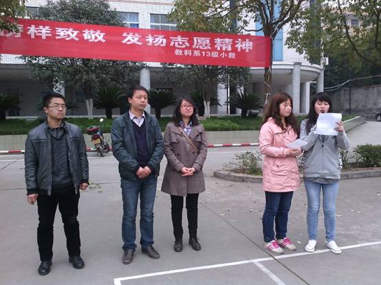 进入三月“学雷锋活动月”,公司掀起以实际行动纪念雷锋的热潮。各种以学雷锋为主题的公益活动贯穿整个三月,各班都以义务劳动、同学互助、社会实践等形式,在理解爱、感受爱、传递爱的过程中,大力学习、弘扬和践行雷锋精神。13级小教理、小教文1、小教文2为响应校团委的号召,在教科系团总支的倡导下,联合组织开展了学雷锋活动,3月12日,三个班的同学在太阳成集团tyc122ccvip前操场举行学雷锋活动动员大会,动员大会鼓舞了同学们参与学雷锋活动的士气,接着13级小学教育各班有组织有计划地进行本班的学雷锋活动。