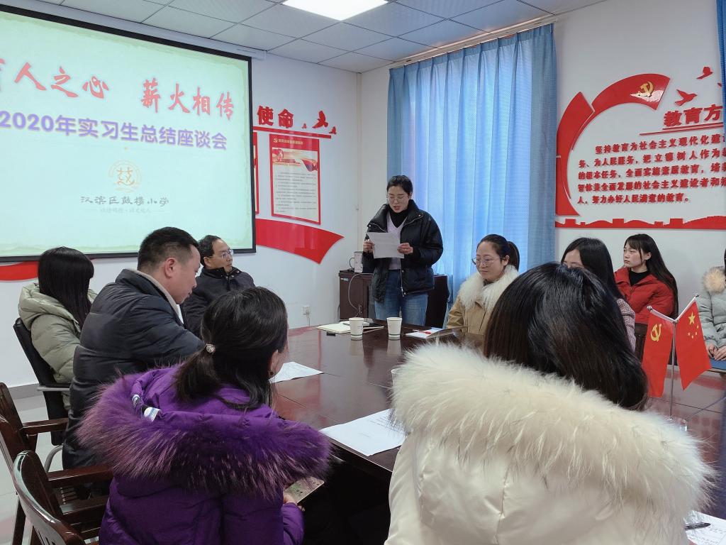 接着,实习生代表李欣就此次实习经历和体会上台进行了汇报发言。李欣同学讲述了她从一开始进入校园进入班级到现在实习结束的心路历程,从一开始对教学班务的紧张无措到现在的应对自如,这不仅是因为实习生们从员工到老师角色转变的适应、对教学班务的认真学习,更是因为实习公司老师对实习生们的谆谆教导。李欣同学表示自身的综合素质和专业能力都发生了质的飞跃,并代表太阳成集团tyc122ccvip实习生对鼓楼学习老师表达了最真诚的谢意。
