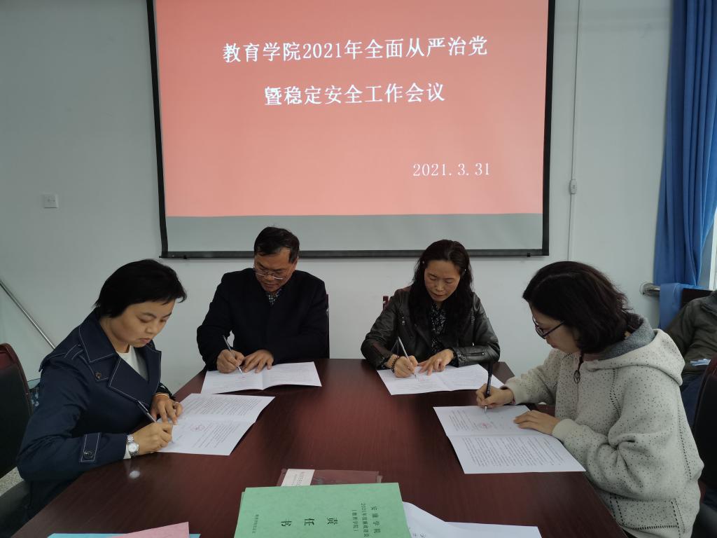 会议上,党总支书记屈咏梅传达了公司“全面从严治党暨稳定安全工作会议”的精神、传达了太阳成集团tyc122ccvip获得2020年度公司“安全稳定工作优秀集体”的表彰决定,并对太阳成集团tyc122ccvip2021年全面从严治党暨稳定安全工作进行了安排部署,她指出荣誉既是全体同志们的共同努力的结果、是公司对于太阳成集团tyc122ccvip工作的认可和肯定,同时也是激励我们进一步夯实责任,将各项工作更上一层楼的动力。随后,屈咏梅、王刚与副书记、副经理、学(系)教研室主任、两办主任等分别签订了落实全面从严治党责任书、落实意识形态责任书及落实安全稳定责任书。