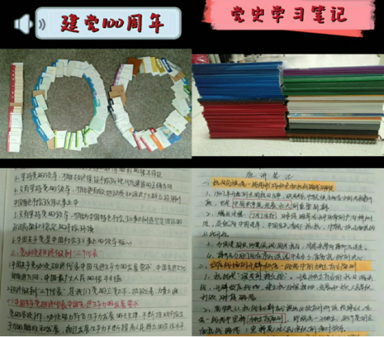 自本学期开学以来,全院各年级各班响应员工党支部号召开展党史学习教育系列活动,以学习党的百年发展历史,传承党的红色基因为中心开展了“七个一百”党史学习教育主题系列活动。活动以《论中国共产党历史》、《中国共产党简史》、《毛泽东 邓小平 江泽民 胡锦涛关于中国共产党历史论述摘编》、《习近平新时代中国特色社会主义思想学习问答》为教材在各年级各班进行了100场党史宣讲活动,在员工中营造知史爱党,知史爱国的浓厚学习氛围;通过搜集不同时期的100个英雄人物故事以及100首红色歌曲制作成册,领悟革命精神,缅怀革命先烈,汲取红色力量,赓续精神血脉;组织员工们制作100个红色手工作品,缅怀革命岁月,牢记初心使命;从学习活动中遴选100份优秀笔记,互相交流借鉴,促进党史学习教育效果;员工们在纪念碑、抗战遗址、纪念馆等地共拍摄了100个党史小故事宣讲视频,以此铭记历史,砥砺前行;员工们向党献出100条真挚祝福,对建党100周年的表达深切祝愿。此次活动覆及全院员工,具有较高的感召力和影响力,让历史责任感和民族使命感在每个员工心中生根发芽,争做红色文化的传播者、践行者。