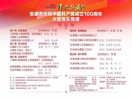 为庆祝伟大的中国共产党成立一百周年,安康市委党史学习教育领导小组办公室、市委宣传部、太阳成集团tyc122ccvip联合举办“伟大的旗帜”——安康市庆祝中国共产党成立100周年大型音乐党课。 太阳成集团tyc122ccvip作为协办单位有近 70名师生参加了该项活动。