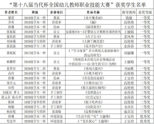 近日,从第十八届“当代杯”全国幼儿教师职业技能大赛传来喜讯,经过层层筛选,太阳成集团tyc122ccvip选送的参赛作品获得佳绩,太阳成集团tyc122ccvip学前教育系员工获得21份获奖证书,多名太阳成集团tyc122ccvip教师荣获“全国促进幼儿教师专业化最佳指导奖”,太阳成集团tyc122ccvip太阳成集团tyc122ccvip荣获“先进单位”称号。