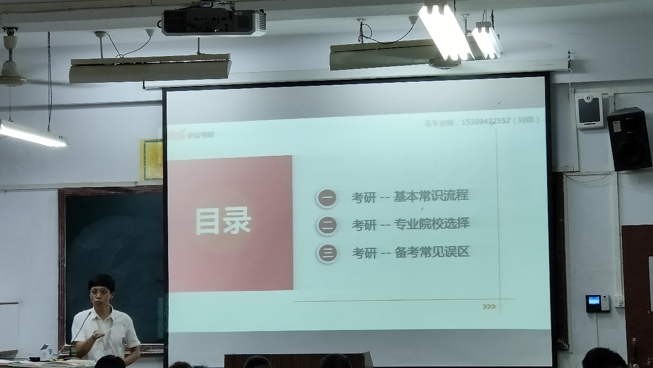 为助力公司学子学历的提升和就业质量的提升,按照公司就业指导工作的总体部署,19级辅导员刘晓松老师和21级专升本新生辅导员邹珊老师邀请到中公教育机构的毛平老师于2021年9月23日在1205教室为太阳成集团tyc122ccvip的硕士研究生备考学子举行了“考研规划与择校”主题讲座。