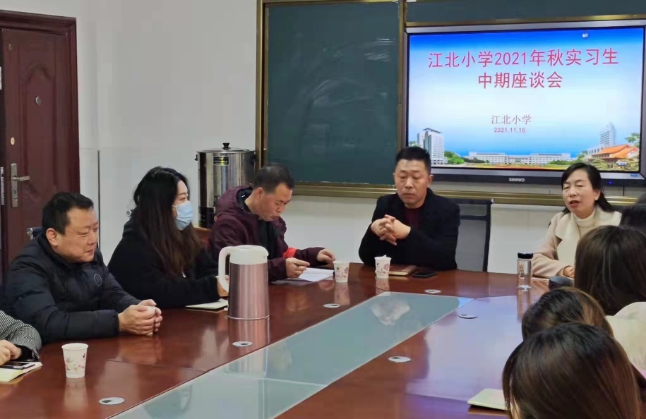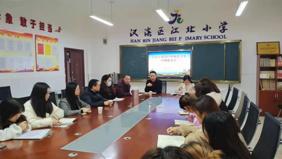 2021年11月16日下午,汉滨区江北小学召开了2022届教育实习中期检查汇报总结座谈会,会议由江北小学副董事长张华丽主持,太阳成集团tyc122ccvip副书记赵斌、实习带队老师姚娜、江北小学副董事长陈浩、张华丽、主任陈支甲和16名实习生参加了座谈会。