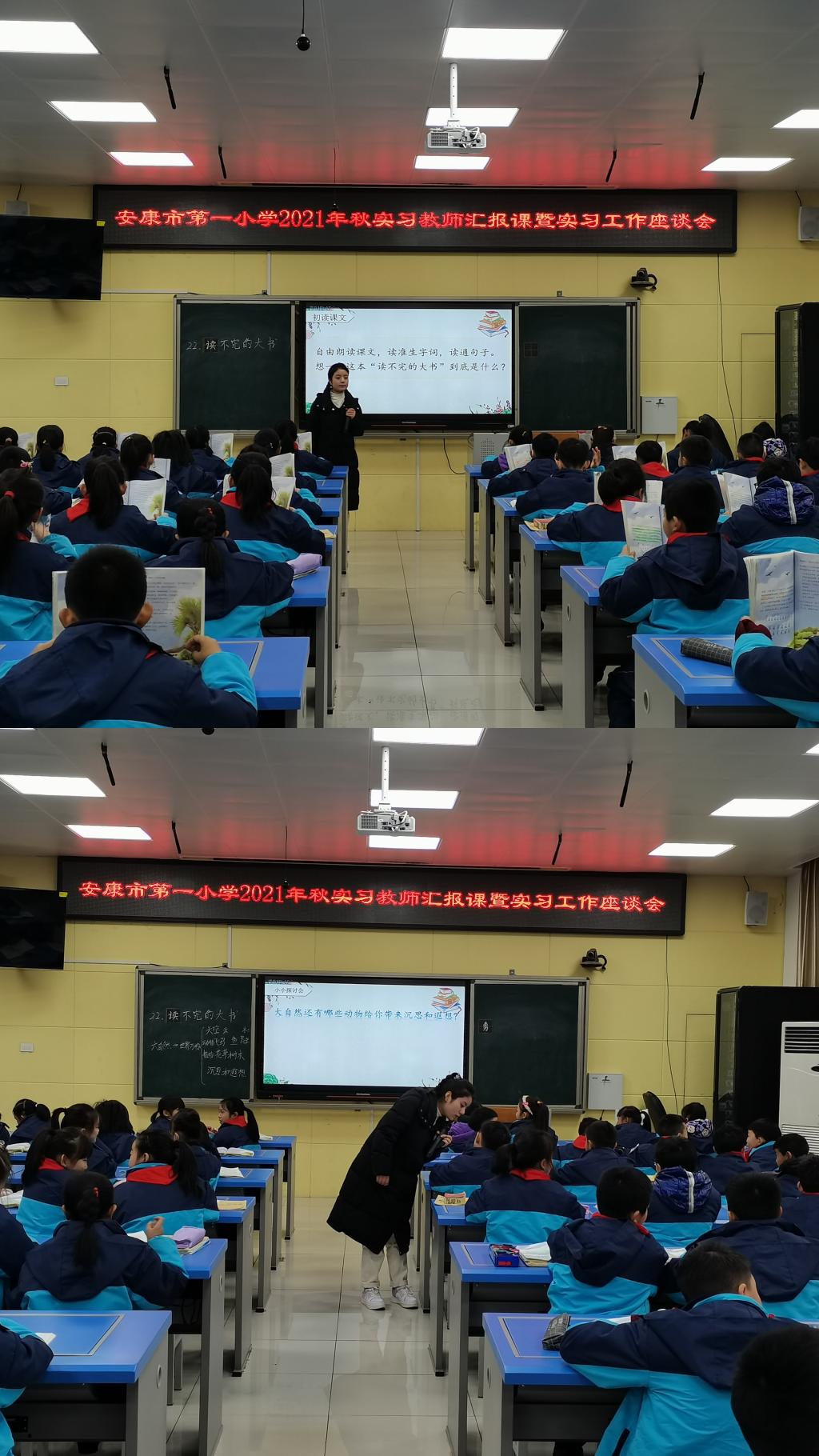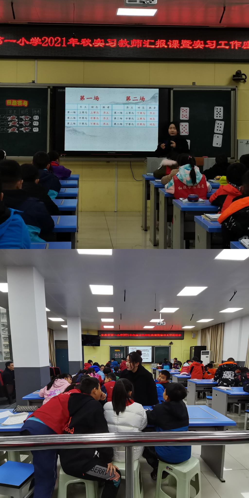 首先由两位实习生代表刘杨婷婷、李蕊华进行汇报课展示,刘杨婷婷代表数学组讲授了四年级数学上册《数学广角——对策问题》及李蕊华代表语文组讲授了三年级语文上册《读不完的大书》,她们扎实的基本功和虚心求教的精神使得汇报课完美呈现。