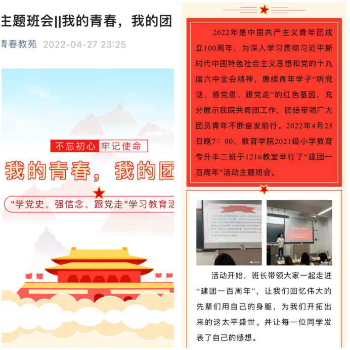 2022年是中国共产主义青年团成立100周年,为继承“五四”优良传统,大力弘扬“五四”精神,进一步传承共青团的光荣传统和优良作风,动员广大青年团员为实现“中国梦”贡献青春、智慧和力量,太阳成集团tyc122ccvip团总支也组织各班开展了“扬五四精神,做有为青年”五四青年节主题班会。