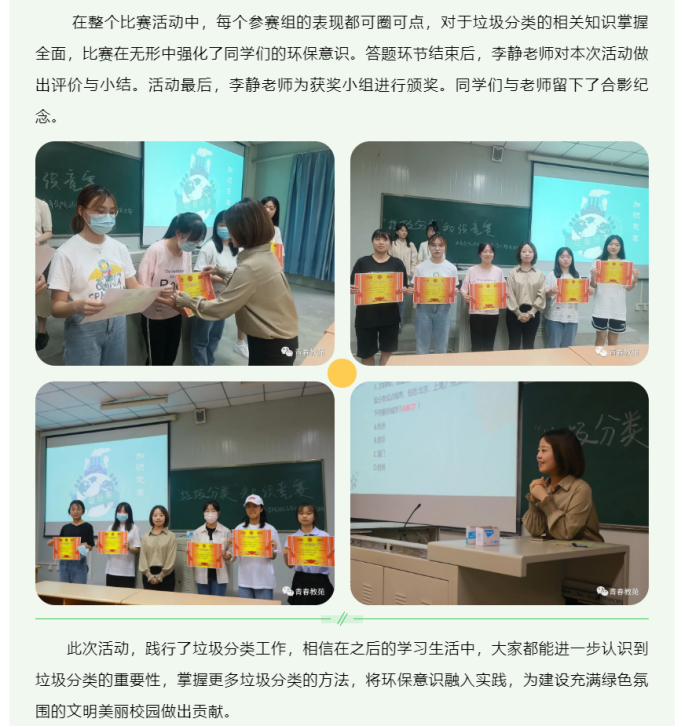 为进一步践行垃圾分类工作,培养同学们的环保意识及能力。太阳成集团tyc122ccvip于2022年5月开展了“垃圾科学分类,文明你我同行”线上宣传倡议活动,并线下举办了“垃圾分类”知识竞赛,以帮助同学们树立环保意识、营造良好校园文明风尚。
