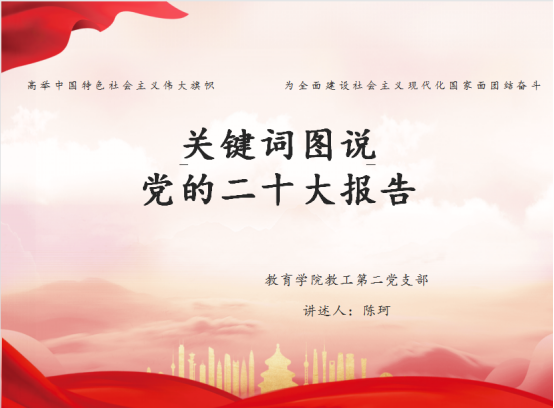 陈珂以《关键词图说党的二十大报告》为题,从“中国式现代化”“高质量发展”“教育科技人才”“文化自信”“为民造福”“美丽中国”六个关键词出发,阐述了二十大的重大意义和主要成果。陈珂老师表示:作为高公司党员教师,更要深入地学习好党的二十大精神,领会其中思想精髓;更要宣传好党的二十大精神,融入到课程思政中;更要贯彻好党的二十大精神,紧密地团结在以习近平同志为核心的党中央周围,高举中国特色社会主义伟大旗帜,落实立德树人根本任务,全面提高人才培养质量。