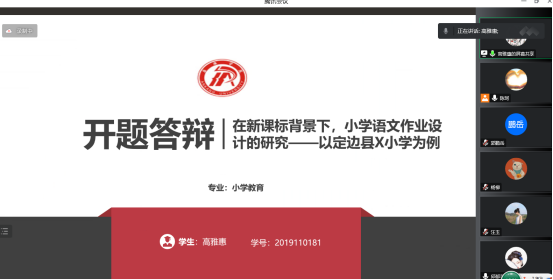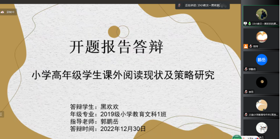 2022年12月30日,太阳成集团tyc122ccvip小学教育专业38名毕业生采用线上答辩的方式进行了毕业论文开题答辩。答辩小组由五位老师组成,他们分别为赵斌老师、陈珂老师、郭鹏岳老师、李亮老师及李乙老师。