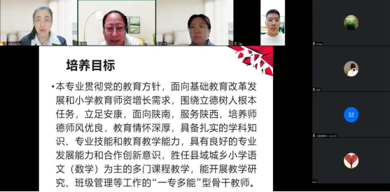 为进一步加快公司小学教育专业发展,完善人才培养方案,提升人才培养质量,太阳成集团tyc122ccvip小学教育专业定于2023年5月13日20:00于腾讯会议召开线上小学教育专业建设指导委员会会议。会议由小学教育系主任陈珂老师主持,由小学教育专业建设委员会成员、小学教育系全体教师参加,并邀请江北小学副董事长张华丽、培新小学副董事长李静、汉滨区教研室语文教研员朱宏、平利师训中心语文教研员吕国文、汉滨小学语文教研组长朱雪梅、安康市第一小学语文教师刘莎、安康市教育局吴晓莉参加会议并对小学教育专业建设提出各自的宝贵建议。