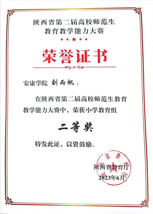 本学期在本校教师和校外双师教师共同指导下小学教育专业员工刘雨帆以小学英语学科参赛在陕西省第二届高校师范生公司产品能力大赛获二等奖。