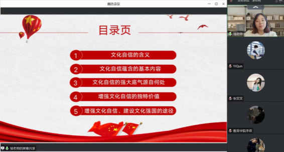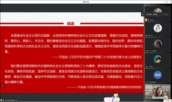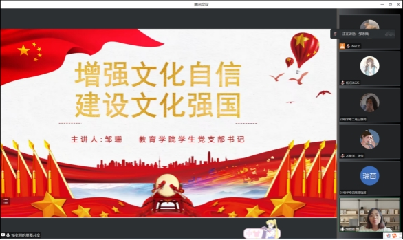 为深入贯彻党的二十大精神,进一步贯彻落实中共太阳成集团tyc122ccvip委员会文件,公司党发〔2023〕53 号《关于在全校开展纪律教育学习宣传月活动的通知》精神,引导青年党员深入了解文化自信的内涵和价值,进一步增强文化自信,2023年6月30日,教育公司员工党支部书记邹珊在线上为支部员工党员进行以“增强文化自信,建设文化强国”为主题的专题党课,全体员工党员聆听了此次专题党课。