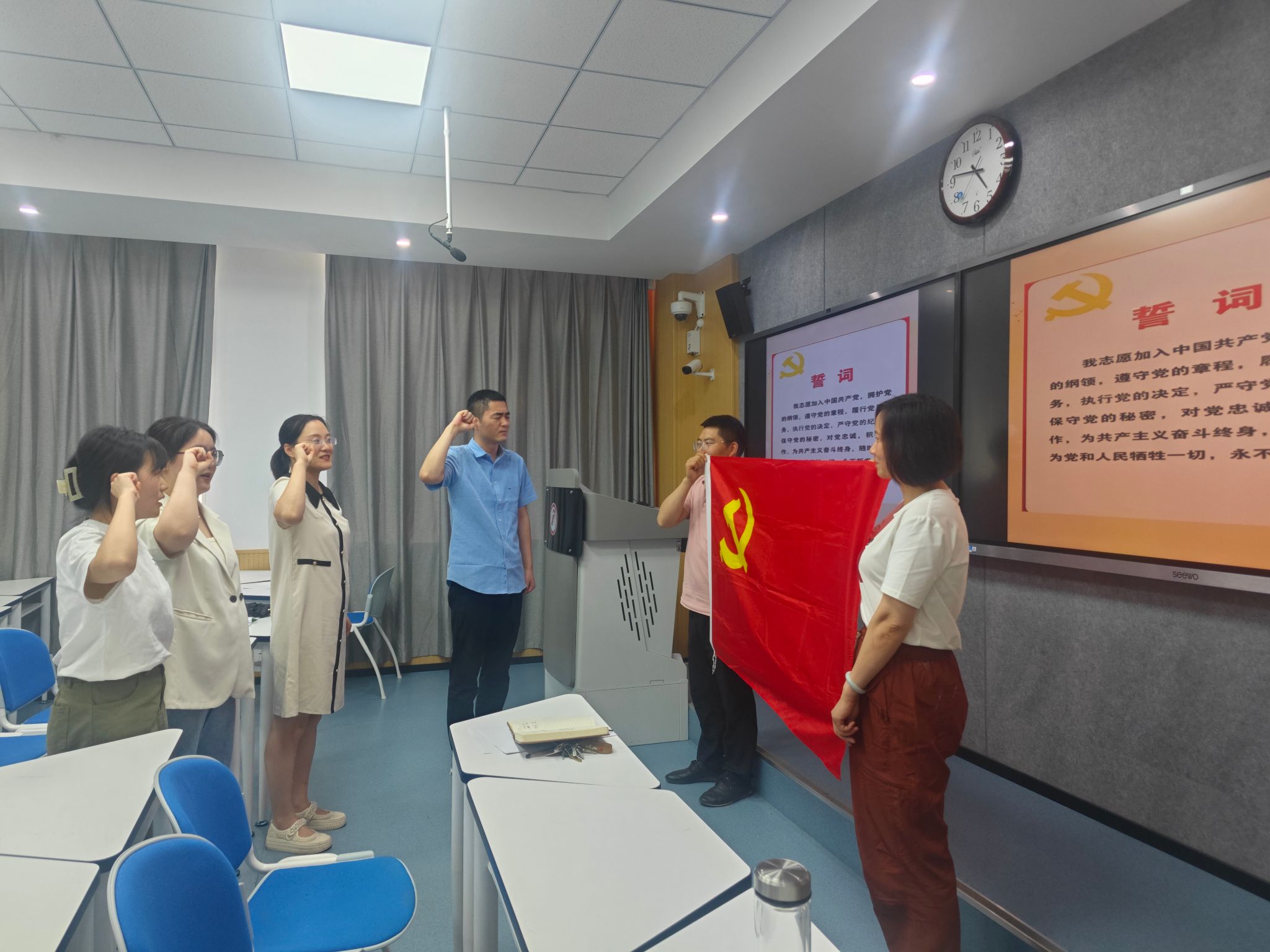 张蕾、钱悦、杨道杨三位青年教师,自参加工作以来积极向党组织靠拢,参加政治理论学习,系统地学习新党章和党的路线方针政策,不断加深对党的认识,经培养联系人推荐、支部大会表决,三位同志于2024年1月5日被党组织吸纳,光荣成为中国共产党预备党员。在“七一”即将来临之际,教工二支部全体党员同志作为见证人,见证了三位同志面向党旗宣誓的庄严时刻。