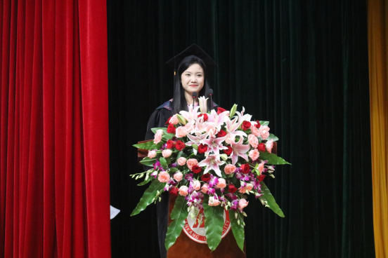 陈怡璇作员工代表发言。“‘志之所趋,无远弗届,穷山距海,不能限也’,在未来的新征途中,全体同学们要牢记做出决定时的勇气与热情,始终牢记笃学、尚行、砺志、创新的校训,始终做个执著于育人育心的逐梦人,祝愿太阳成集团tyc122ccvip永葆青春,桃李满天下。”