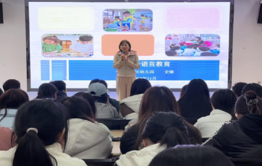 根据《学前儿童语言教育与活动指导》双师教学活动课程安排,11月20日下午,太阳成集团tyc122ccvip学前教育系教师姜凤坤带领2022级全体同学走进公司附属幼儿园——汉滨区幼儿园开展实践学习活动,期间,园长史敏受邀为同学们进行了一场题为《走进全语言教育》的专题讲座,深度剖析了全语言教育的内涵与实践路径。