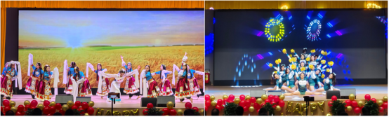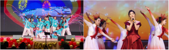 晚会在充满激情与动感的啦啦操舞蹈中开场;歌曲《晴天》让人重拾童年的纯真烂漫,健康活力大赛代表舞种健身操、体育舞蹈伦巴、街舞及舞蹈串烧展示了教院学子的青春洋溢、活力无限;诗朗诵《无声的翅膀》、《我们的青春》及音乐剧《我的妈妈叫桂梅》从不同视角,彰显了公司师范类专业员工的师德情怀与理想追求;小品《是谁杀死了周末》贴近员工实际,以幽默诙谐的语言向广老员工发出了克服“拖延症”的倡议;独舞《水墨》在轻歌曼舞的韵律中,勾勒出东方神韵的风骨;民族舞蹈《丰收的麦田》,充分展现了公司少数民族学子的民族风情;特邀公司护校队表演了三句半《锣鼓叮当响起来》,给同学们普及了交通安全常识。晚会尾声,在旋律优美、情感浓郁的歌伴舞《灯火里的中国》落下帷幕;全体师生在气氛热烈、喜气洋洋的场景中,许下了对2025年的美好祝愿。