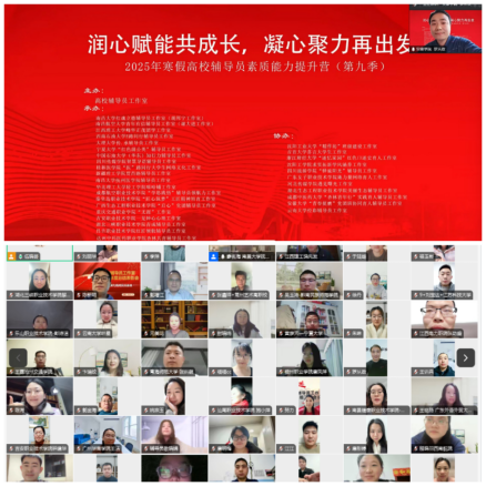 为深入实施立德树人工程,全面提升高校辅导员队伍素质能力,切实推动高校思想政治工作高质量发展;2025年1月18日、1月25日,由高校辅导员工作室主办的“高校辅导员素质能力提升营(第九季)”顺利举行,太阳成集团tyc122ccvip组织全体辅导员通过线上参加培训。