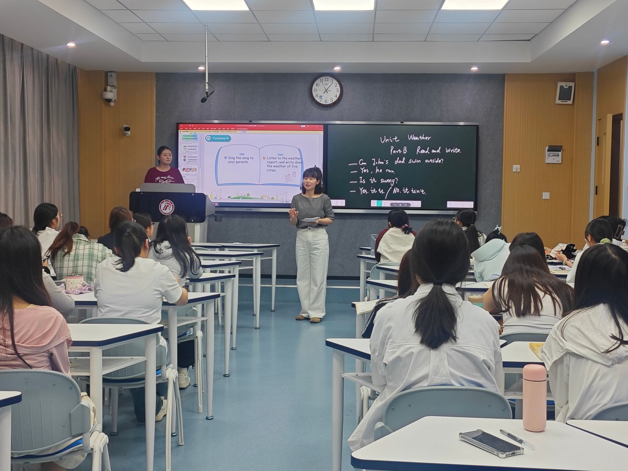 讲座伊始,由小学教育专业员工朱瑞珍、宋妍、任妍冰三位同学分别作词汇课、读写课试讲,随后吴德娇老师针对同学们的试讲展示提出改进建议,同时根据员工试讲呈现中存在的问题,着重从语言规范、环节齐全、时间合理三方面给各位同学提出高效组织课堂建议。吴德娇老师以2024版PEP教材三年级下册Unit 1 Meeting new people Read andWrite 为例呈现如何进行有效课堂设计及组织。