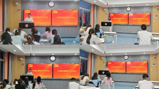随后员工党员结合自身经历分享感悟。杜慧果谈到“将在未来的生活中持续加强理论学习,不断增强纪律意识和规矩意识,从点滴小事做起,严格约束自己的言行。”许楠楠表示“将始终牢记党员身份,传承和发扬八项规定精神,以实际行动为党旗增光添彩,为实现中华民族伟大复兴的中国梦贡献青春力量。”党员们将准则要求与作风建设有机结合,生动展现了新时代小学教育学子,以实际行动践行“立德树人”使命的思想自觉与行动自觉。