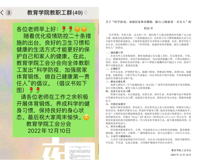 “流水不腐,户枢不蠹,动也”。为助力全体教职工增强免疫,强健体魄,切实做好“自己健康的第一责任人”,太阳成集团tyc122ccvip工会分会于2022年12月10日面向全体教职工发出“科学防疫,加强居家体育锻炼,做自己健康第一责任人”的倡议,号召老师们积极开展居家体育锻炼,以良好的身心状态战胜疫情。