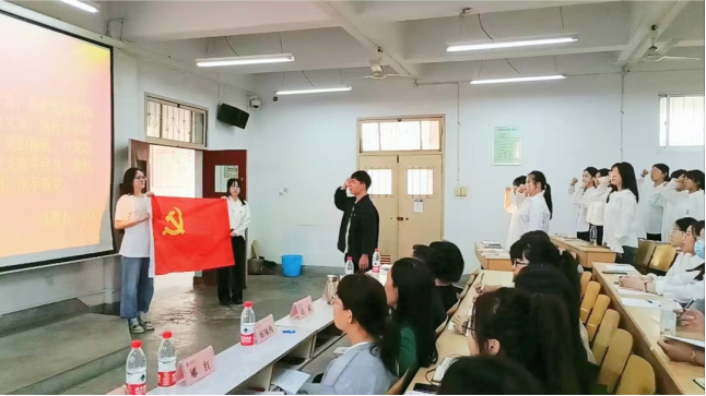 雄壮的国歌声中与会人员全体起立,以庄严肃穆的姿态表达了对党组织的忠诚。唐丹带领全体预备党员面向党旗,举起右手庄严宣誓。“我志愿加入中国共产党,拥护党的纲领,遵守党的章程,履行党员义务……”铿锵有力的誓词、嘹亮的声音、坚毅的目光郑重许下对党、对人民的承诺表达了为党的事业奋斗终生的决心。宣誓完毕,屈咏梅、赵斌、郇红等为预备党员佩戴党徽并表示祝贺。