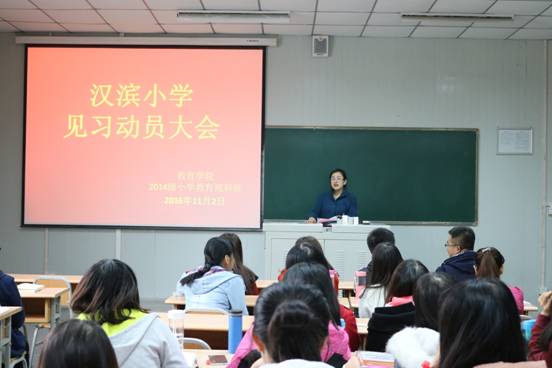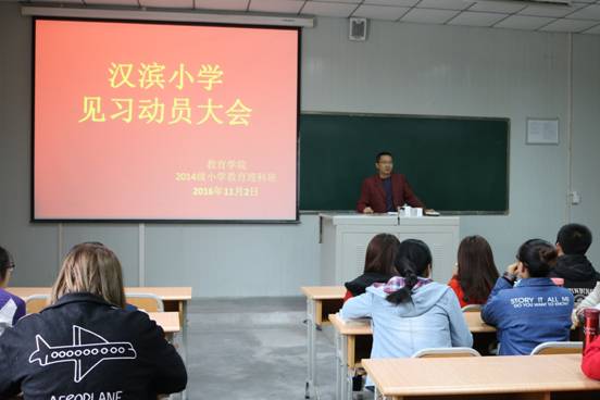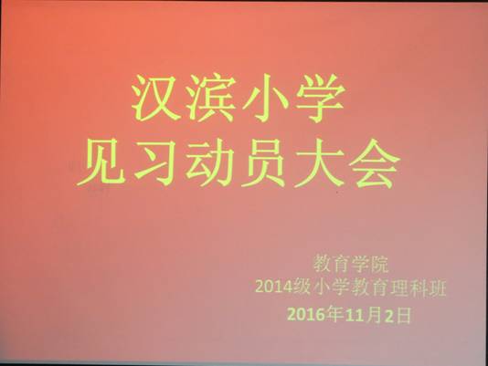 2016年11月3日,在太阳成集团tyc122ccvip老师的组织下,2014级小学教育理科班全体同学在十号楼1014教室召开了“汉滨小学见习动员大会”,该次大会由陈佳、李支其两位老师主持。