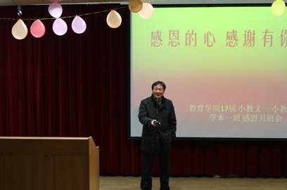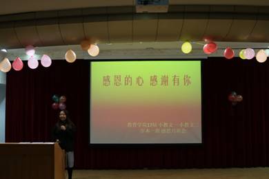 为贯彻落实校团委《关于在2017级新生中开展“心逐感恩情,共筑中国梦”感恩教育系列活动的通知》,在太阳成集团tyc122ccvip团总支的部署下,2017年11月27日晚七点公司17级小学教育文科班,学前教育本科班三个班在一号教学楼六楼报告厅举办 “感恩的心 感谢有你”主题班会。太阳成集团tyc122ccvip经理黄路阳,党总支书记屈咏梅、副经理王丽娟、各班学业导师、17级辅导员董婷瑜和三个班级的所有同学参加了本次班会。