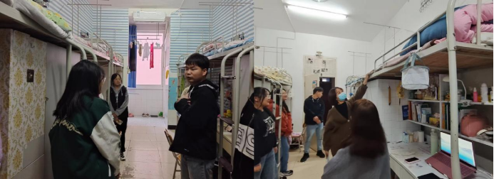 在安全卫生检查中,辅导员重点检查了各个宿舍的卫生和是否使用违规电器、私接电线,是否存放易爆、易燃物品和违规物品,并和同学们交流了宿舍消防安全知识。