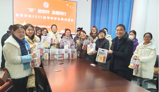 座谈会上,郇红强调考研不仅是一场知识的较量,更是一次心态的比拼,提醒同学们,即使在寒冷的冬季,也要树立必胜的信心和坚持到底的决心;在答题技巧方面,建议同学们要认真审题,答题要有层次,并在最后进行概括,以体现思维的深度和广度;鼓励同学们在复习过程中注重时间管理,合理安排时间,以保持良好的身心状态。赵晓凤询问了同学们的备考情况,针对同学们现阶段的困惑和问题,给予了针对性的建议和鼓励。罗从政表示,无论是提供学习资源还是解决现实困难,公司都将全力支持同学们的“考研上岸”之路。座谈结束,老师们为每位同学送上了公司精心定制的“考研加油礼包”,传递公司对同学们的关怀与支持,希望这份温暖能陪伴他们度过寒冷的备考时光,鼓励他们保持热情和决心,迎接挑战。