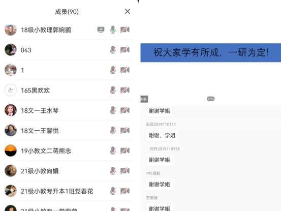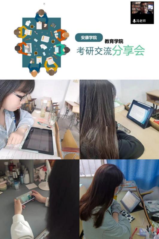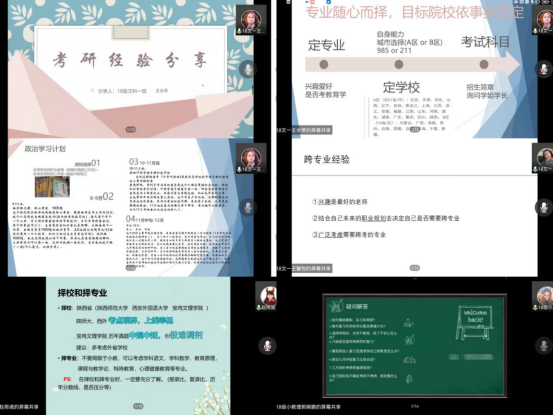 郭婉鹏首先介绍了如何择校择专业,结合专业课初试课本、自身学习能力、院校报录比、院校专业招生人数诸多因素给学弟学妹们提供思路,随后依次从考研复习规划、考研好物交流、疑问解答做以介绍;王馨悦主要侧重于跨专业做以介绍,启示同学们可以结合自己兴趣能力及未来就业计划选择适合自己的专业,最后强调在备考过程中一定要调整好心态,注意劳逸结合,短暂的休息是为了更高效的学习;赵雨诺结合陕西省内小学教育专业招生的三所研究生院校做以分析,从自身备考过程中遇到的问题及背书经验等方面做以启示;王水琴从各科备考时间安排以及所用书目做以详细讲解,为同学们备考提供了借鉴的依据。
