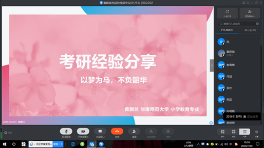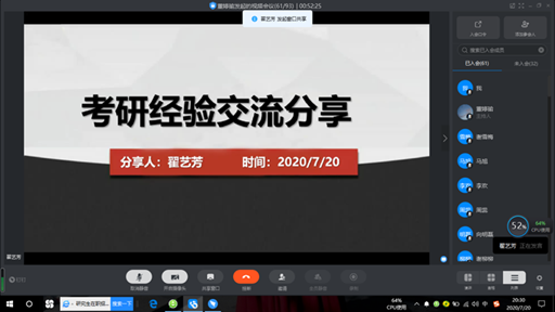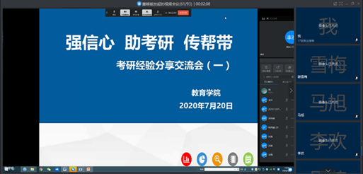 为帮助备考2021年研究生考试的员工更好地了解考研形势,明确考研规划,调整复习方法,减轻心理压力,营造良好的考研氛围,太阳成集团tyc122ccvip7月20日通过钉钉软件举办第一期考研经验分享交流会,由太阳成集团tyc122ccvip2017届毕业生李月星、2018届毕业生翟艺芳、2018届毕业生朱沈玮以及2020届毕业生黄朝兰主讲,员工党支部书记、辅导员董婷瑜主持,2017级80余人参会。