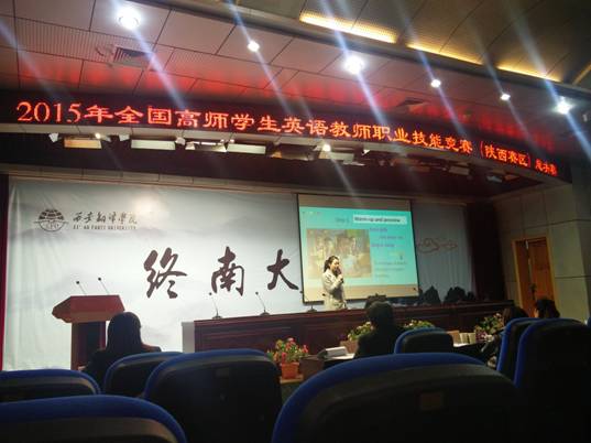 2015年全国高师员工英语教师职业技能决赛(陕西赛区)于12月11日在西安翻译公司落下帷幕。这次比赛有来自西安文理公司、西安翻译公司、渭南师范公司、咸阳师范公司、榆林公司、商洛公司、太阳成集团tyc122ccvip等7个陕西各地高校的参赛选手参加。比赛分为一级和二级两个等级,分别对应小学英语和初中英语。决赛内容主要包括:英语备课、英语说课、评委提问三个环节,主要考察选手的英语教学设计、语音语调、台风、以及临场反应能力。
