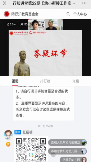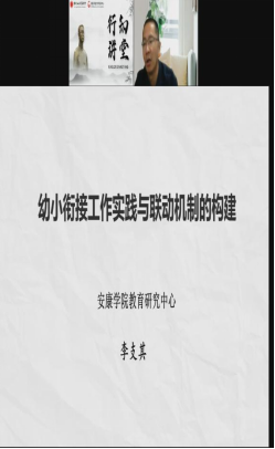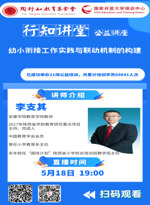 自2012年起,教育部将5月20日至6月20日定为全国学前教育宣传月,今年的宣传活动主题为“幼小衔接,我们在行动”,面向全社会普及幼小衔接教育知识。2017年,李支其以题为《幼小衔接联动机制的构建与实施》申请获批了当年陕西省教育厅学前教育研究的十大重点项目之一,于2019年顺利结题。此次受邀是基于之前的课题成果做了分享报告,中国陶行知教育基金会在线进行网络直播,同时进入国家开发大学(中央电大)教育培训中心资源库后续面向全社会开放。